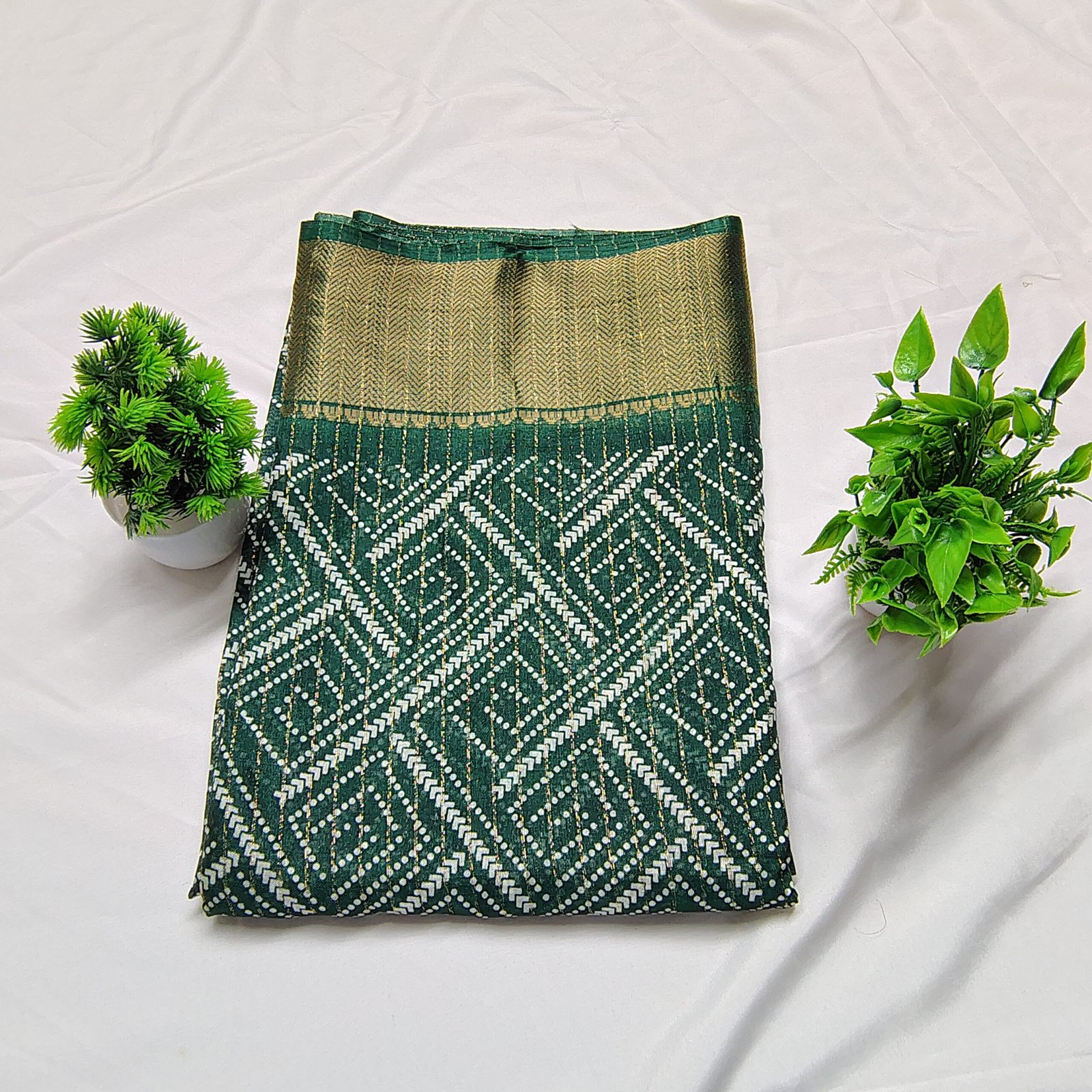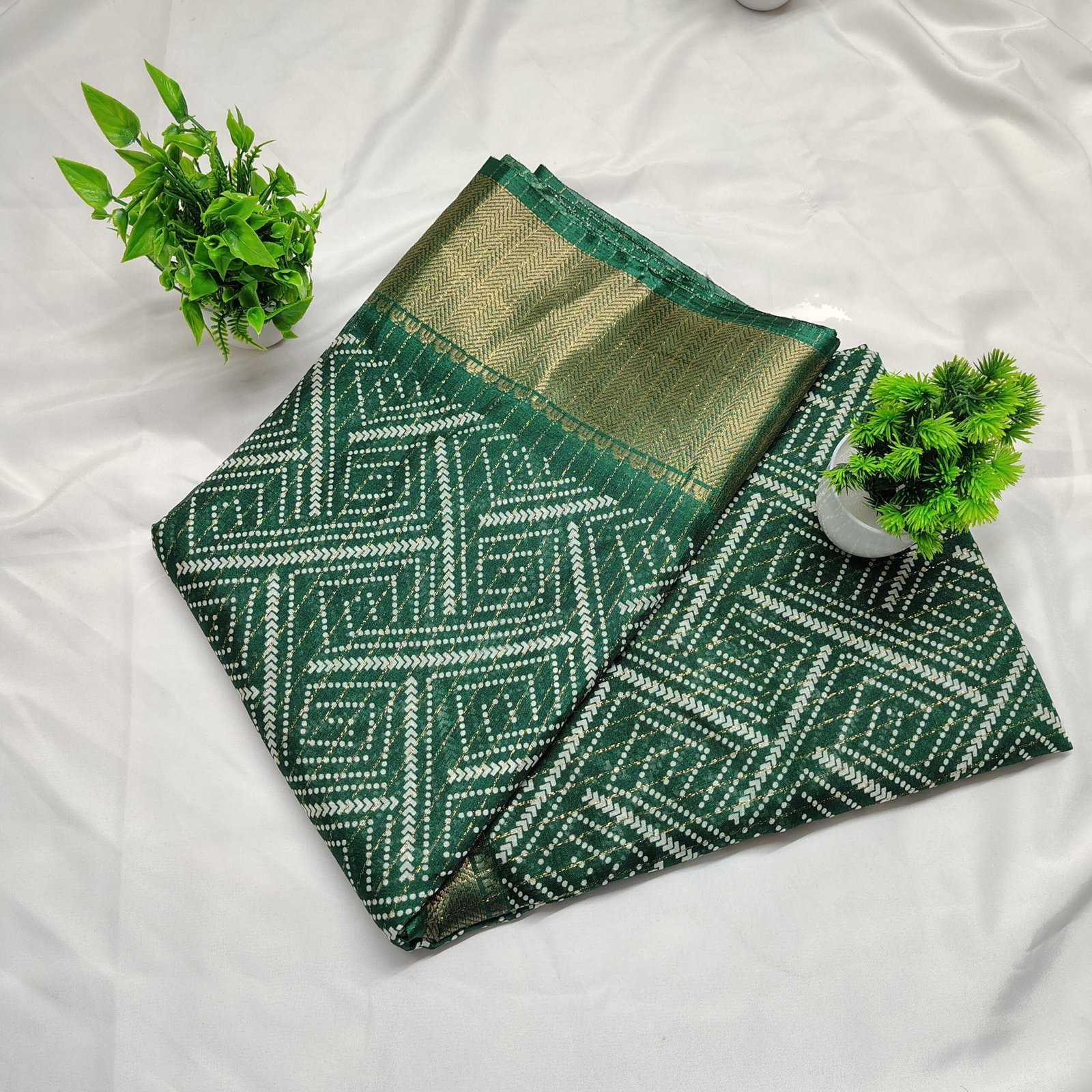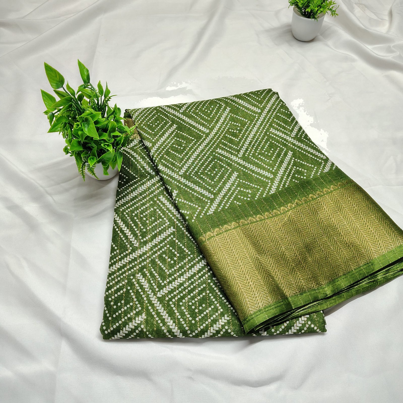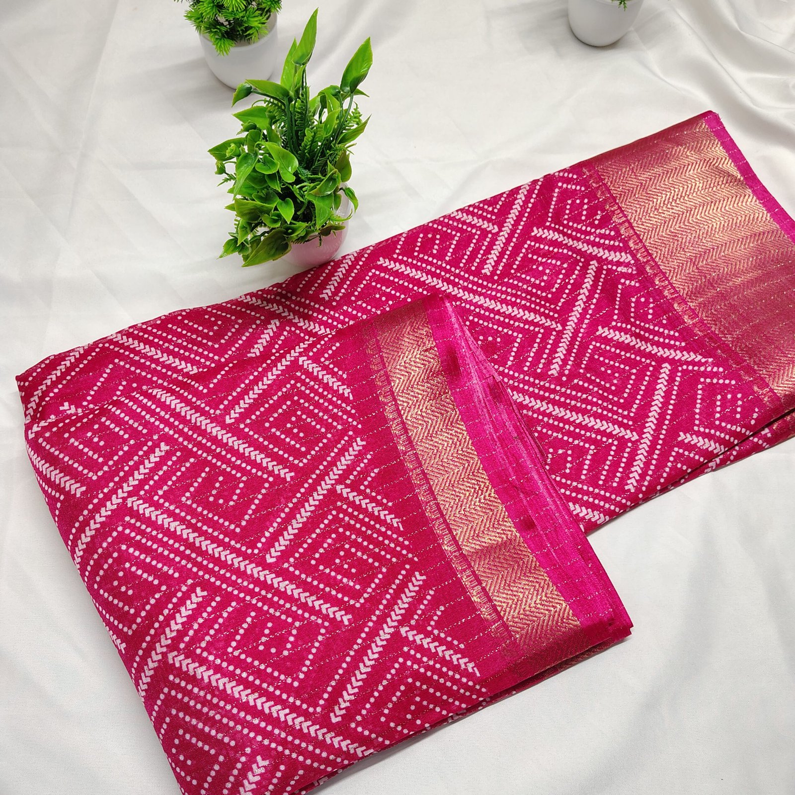 Make a regal statement with this silk saree adorned with intricate white Bandhani-style geometric patterns. The saree is beautifully complemented by a traditional gold zari border that adds a luxurious touch to its classic appeal. Crafted from a premium cotton silk blend, it offers both comfort and sophistication, making it ideal for festive celebrations, family gatherings, or cultural events. Pair it with a matching blouse and traditional jewelry to complete your ethnic ensemble.