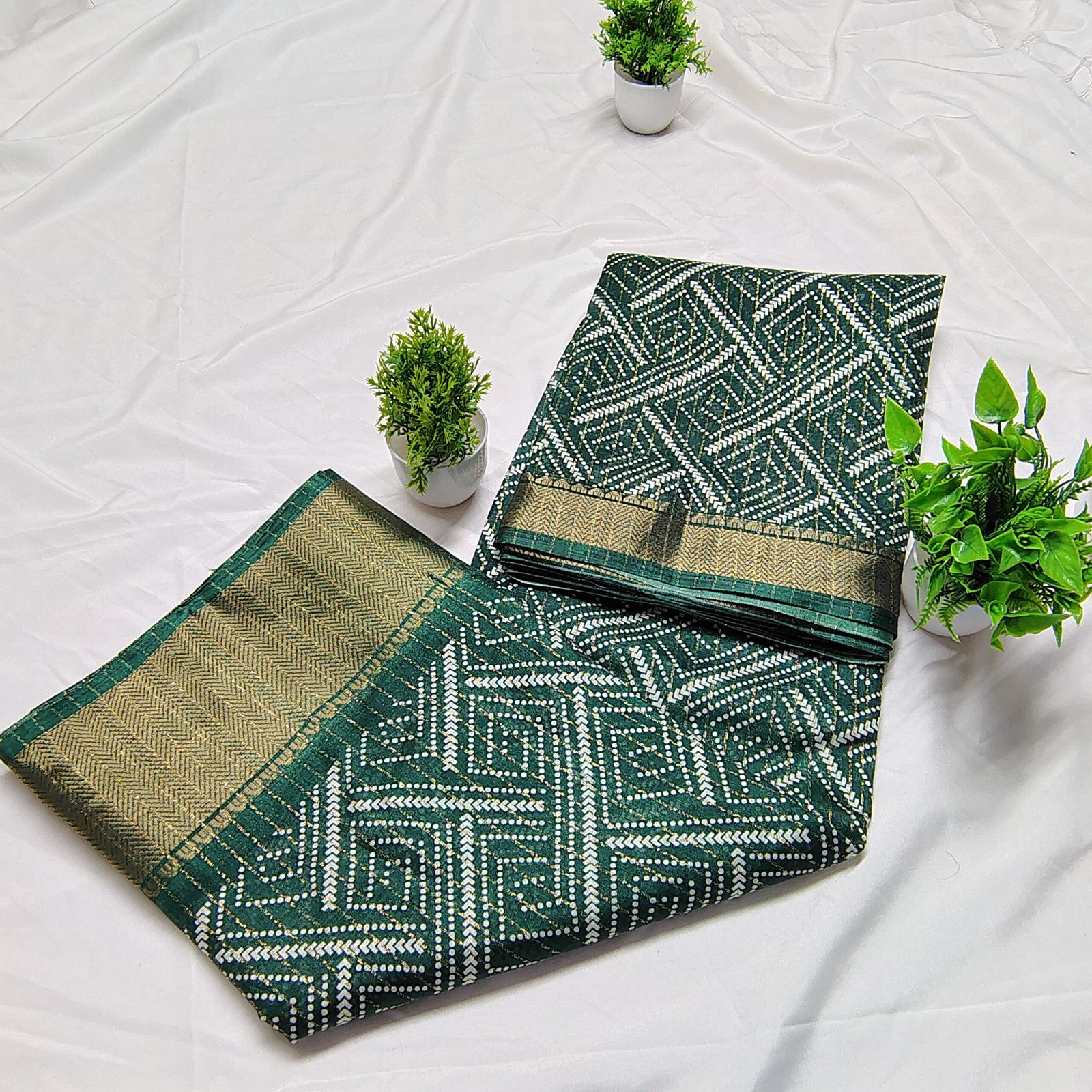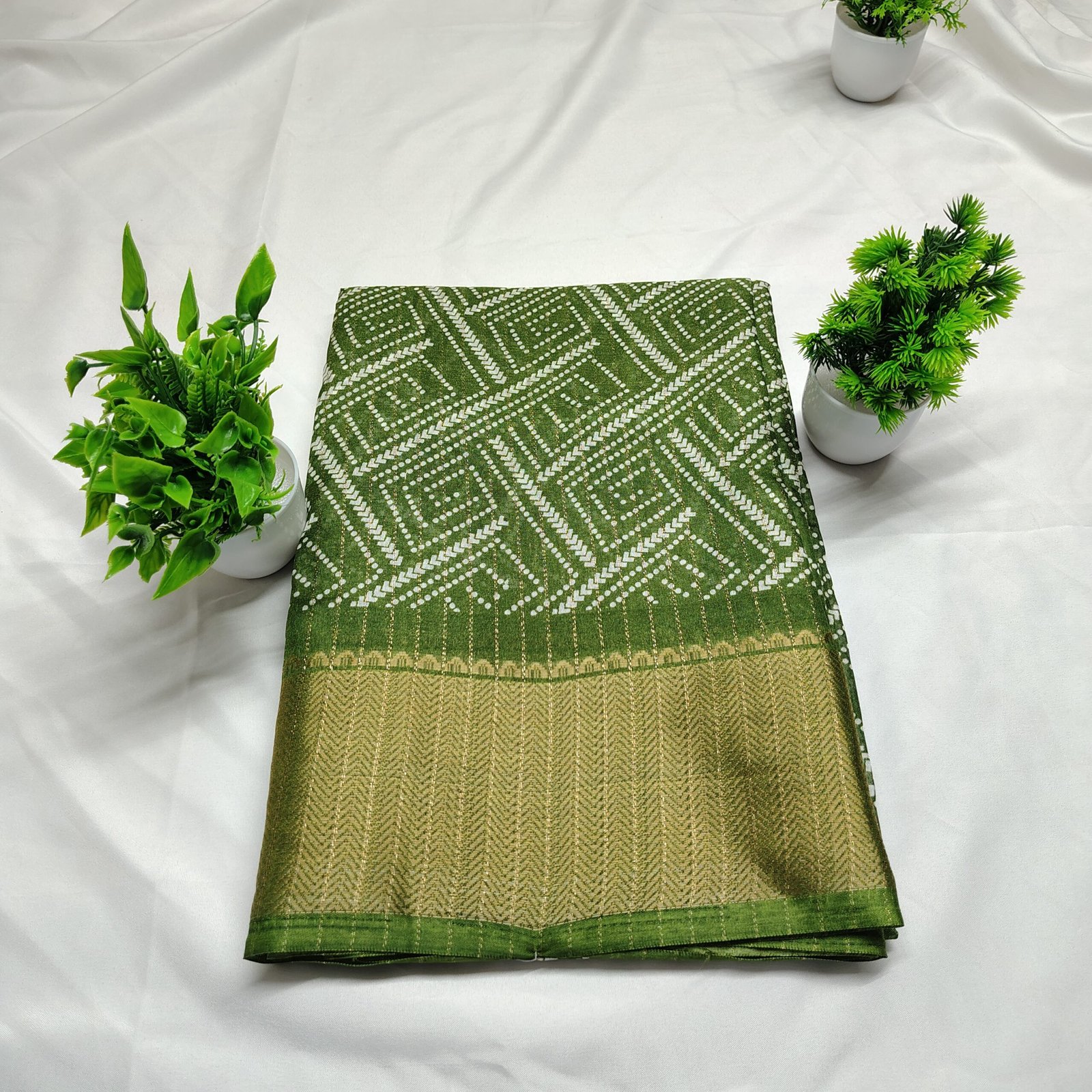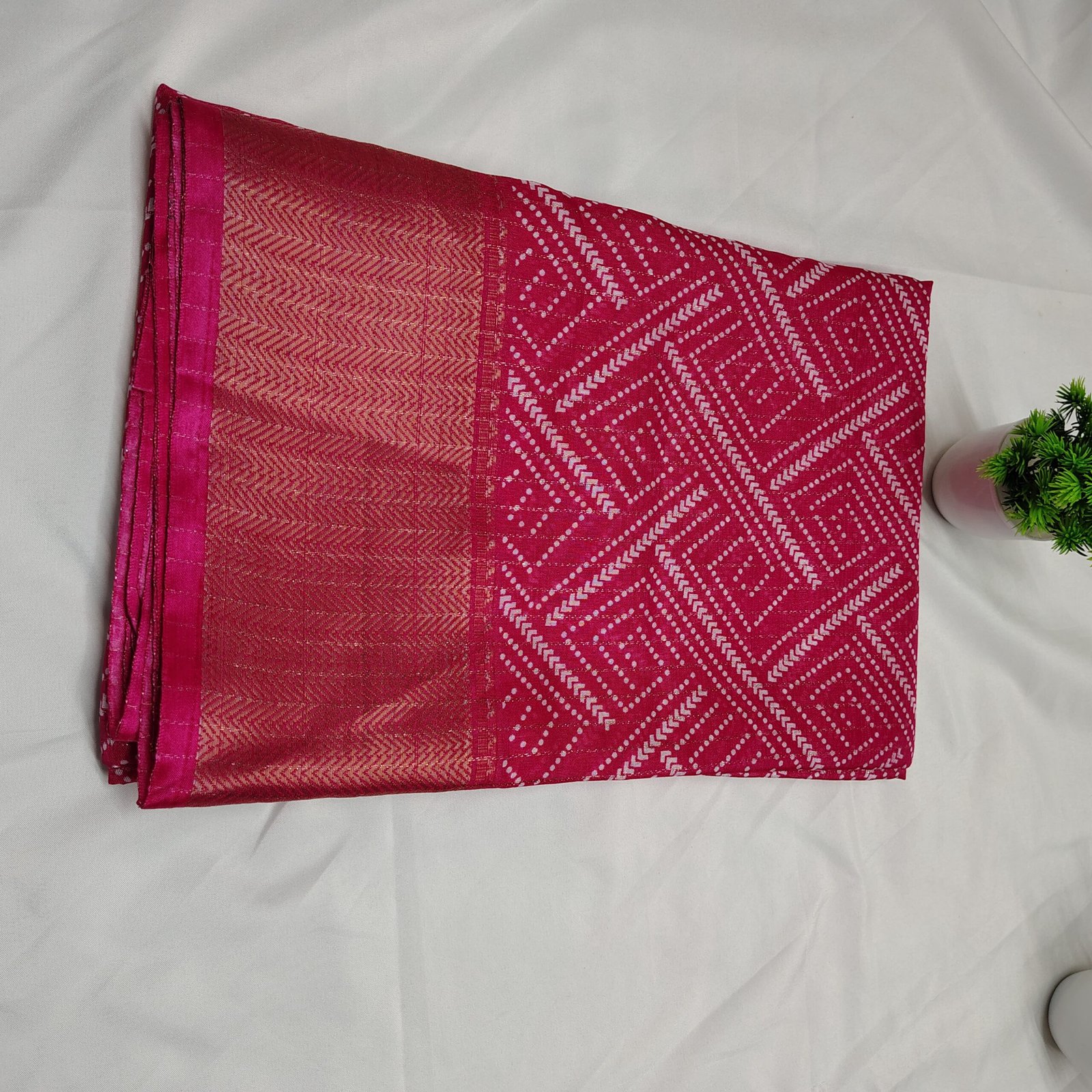 Make a regal statement with this silk saree adorned with intricate white Bandhani-style geometric patterns. The saree is beautifully complemented by a traditional gold zari border that adds a luxurious touch to its classic appeal. Crafted from a premium cotton silk blend, it offers both comfort and sophistication, making it ideal for festive celebrations, family gatherings, or cultural events. Pair it with a matching blouse and traditional jewelry to complete your ethnic ensemble.