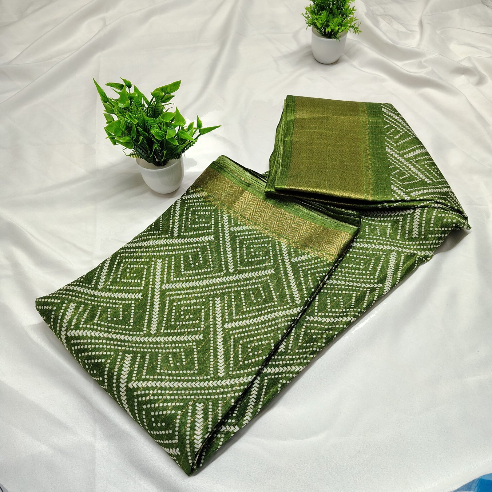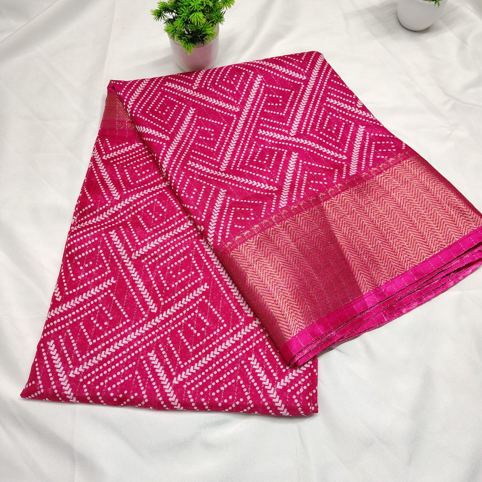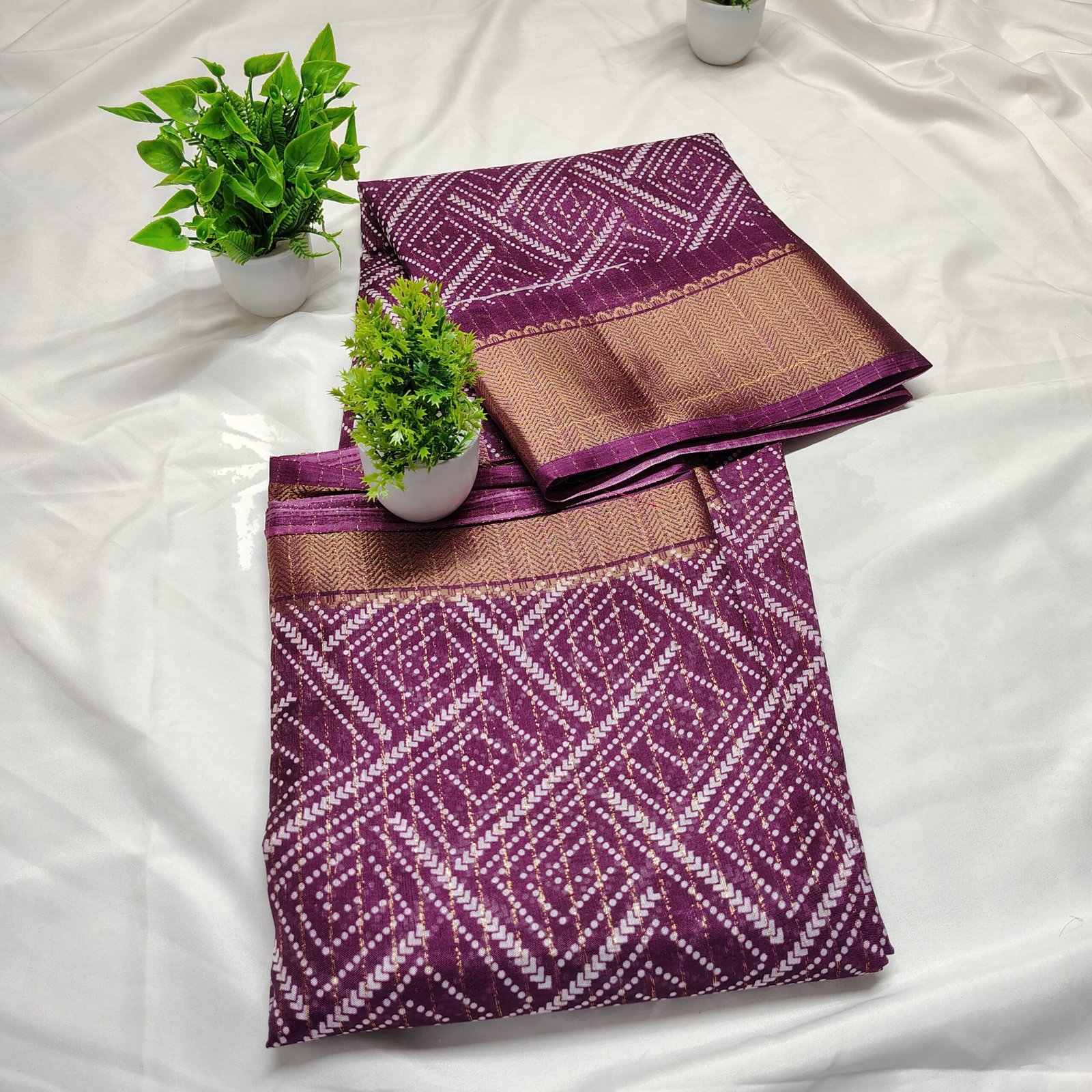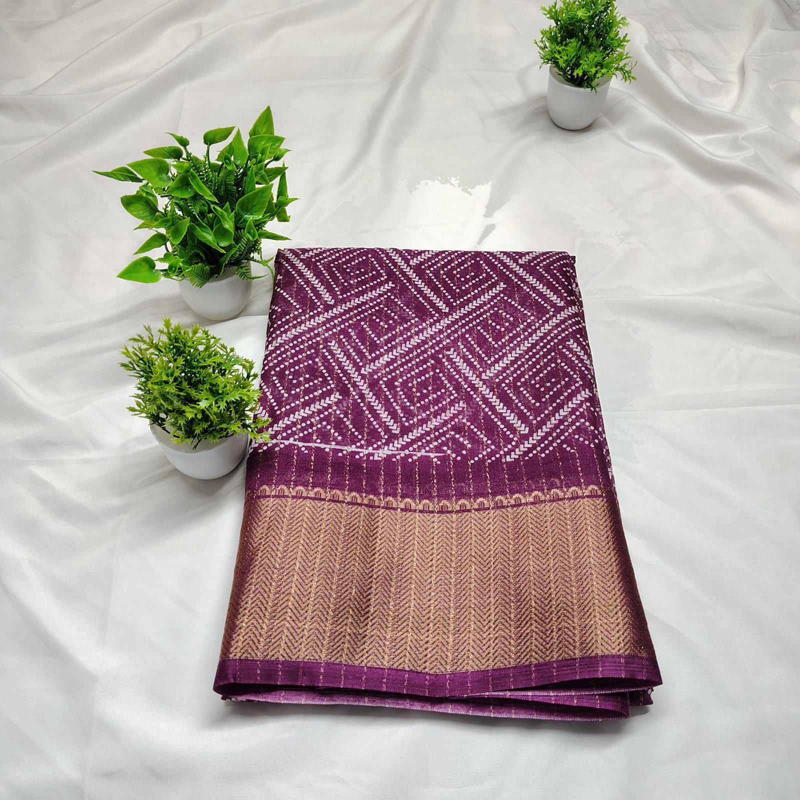 Make a regal statement with this silk saree adorned with intricate white Bandhani-style geometric patterns. The saree is beautifully complemented by a traditional gold zari border that adds a luxurious touch to its classic appeal. Crafted from a premium cotton silk blend, it offers both comfort and sophistication, making it ideal for festive celebrations, family gatherings, or cultural events. Pair it with a matching blouse and traditional jewelry to complete your ethnic ensemble.