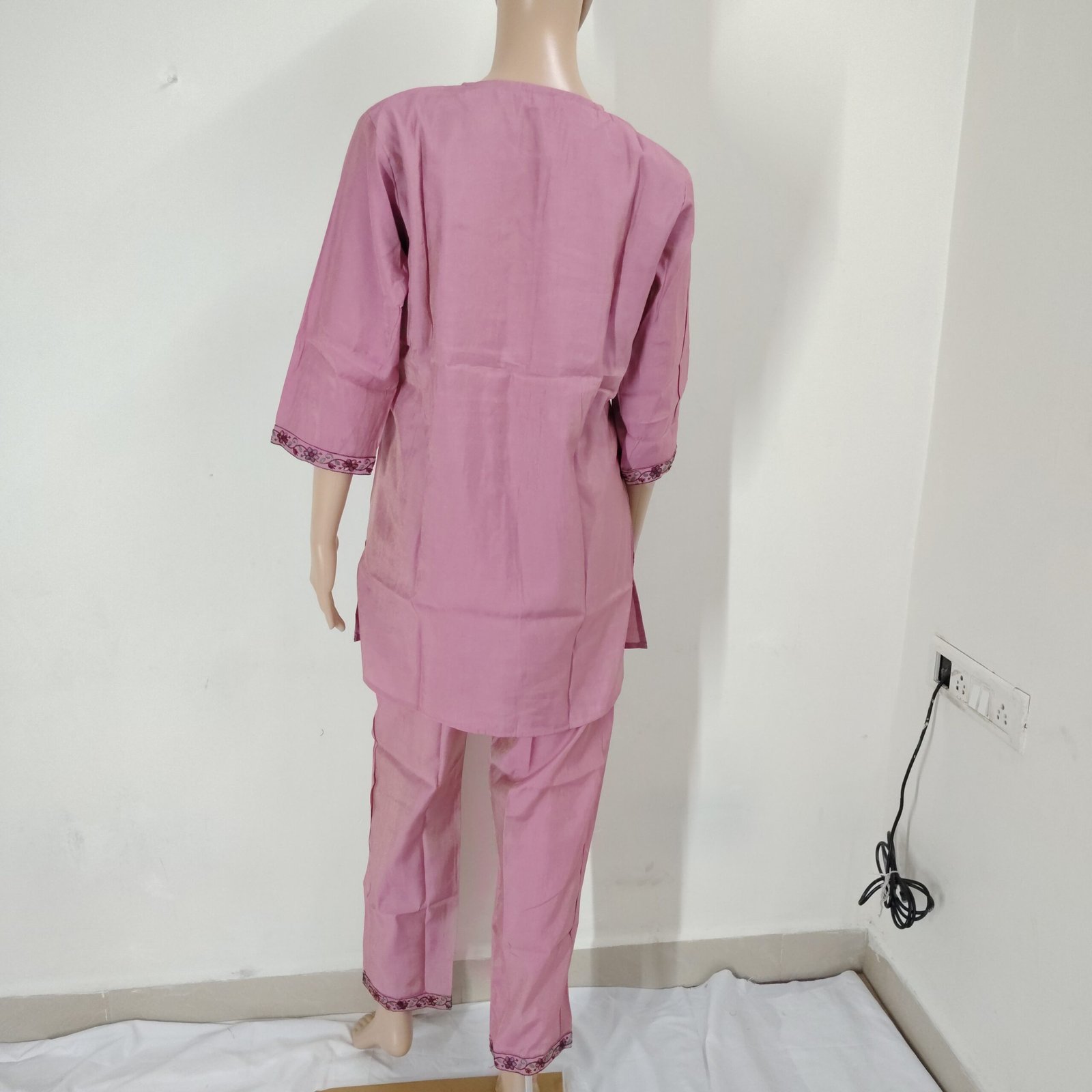 Bring timeless elegance to your wardrobe with this beautifully crafted 2-piece cotton kurti set. Designed in a rich dusty rose pink shade, this outfit features intricate white floral embroidery across the front, sleeves, and hemline, adding a touch of traditional charm with a modern appeal.