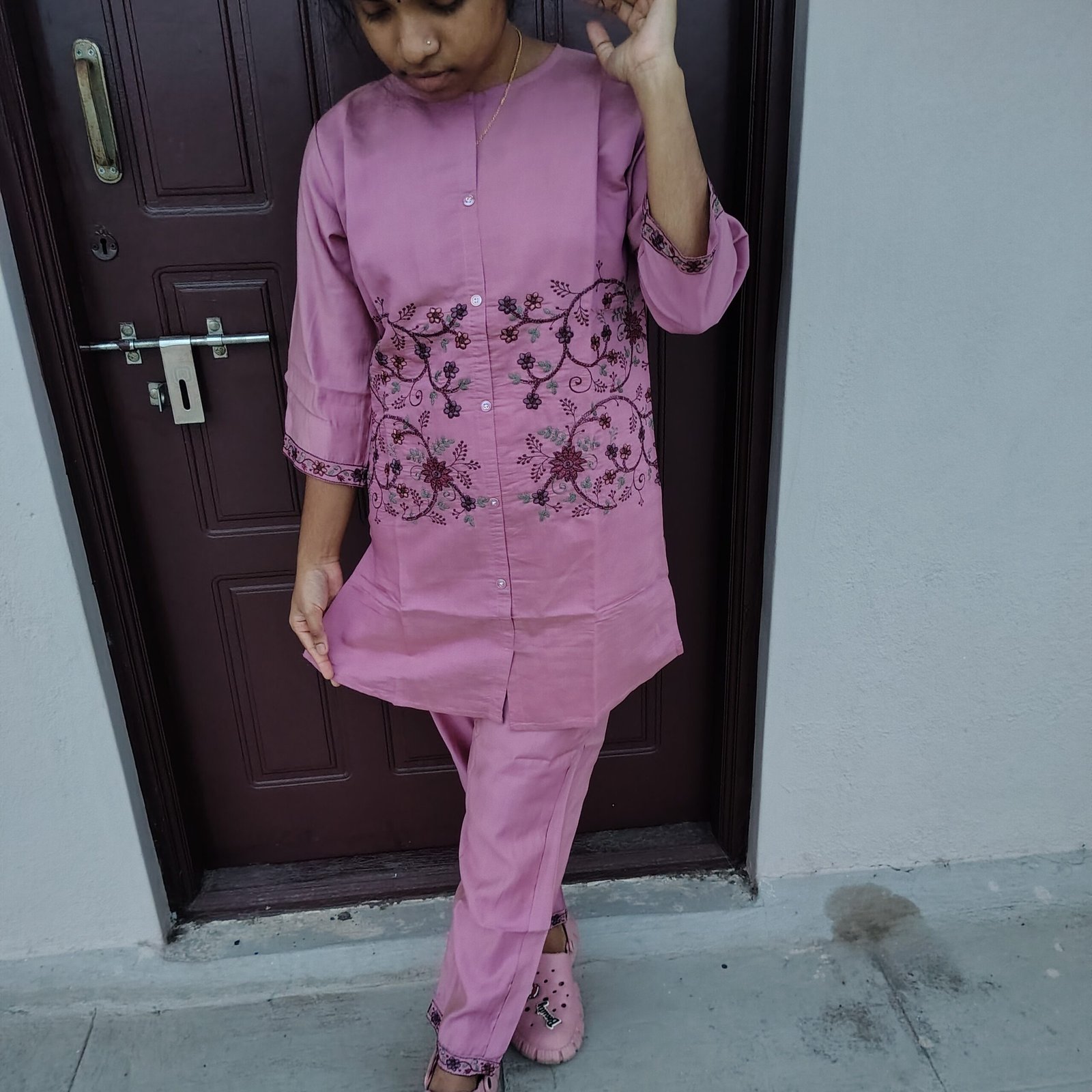 Elegant dusty rose pink Embroidered rayon Cotton sighning Kurti Set